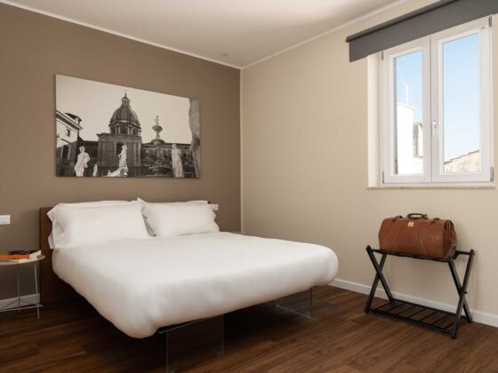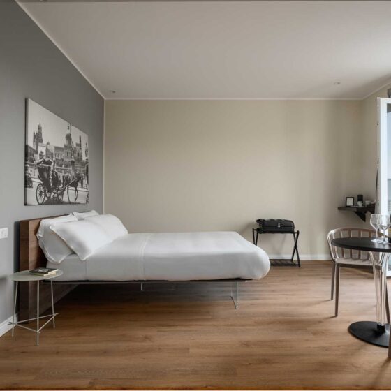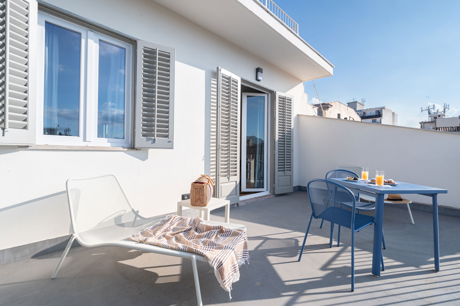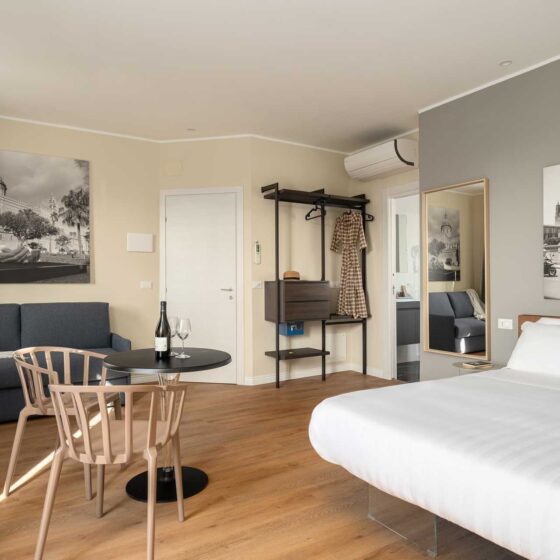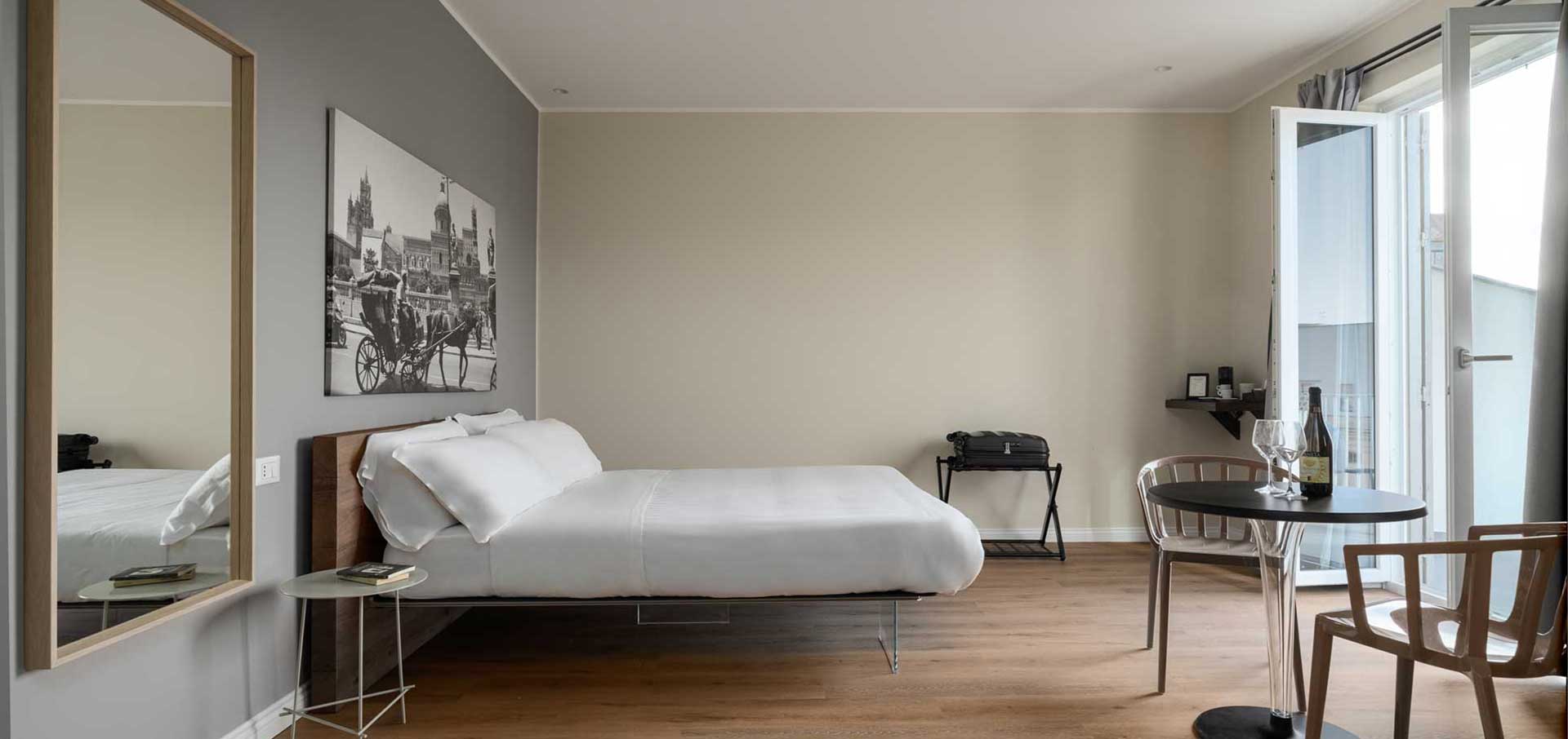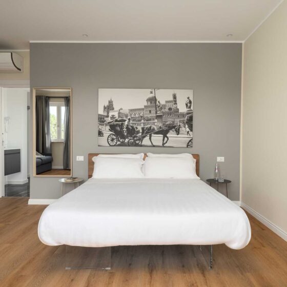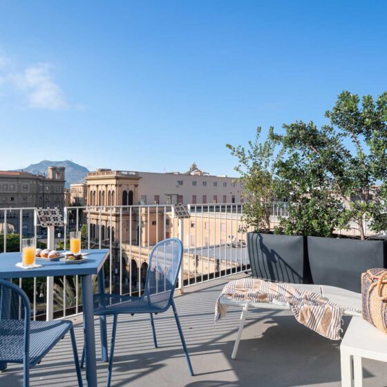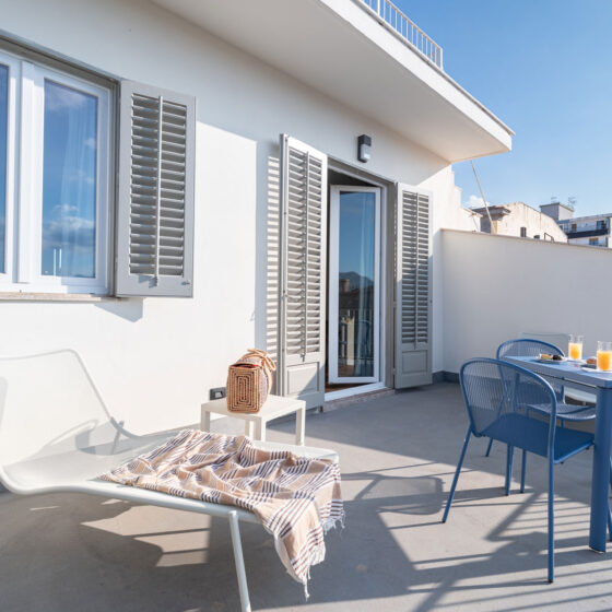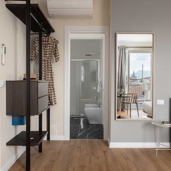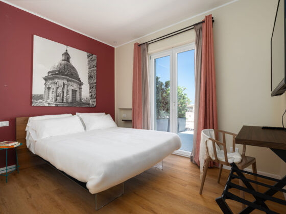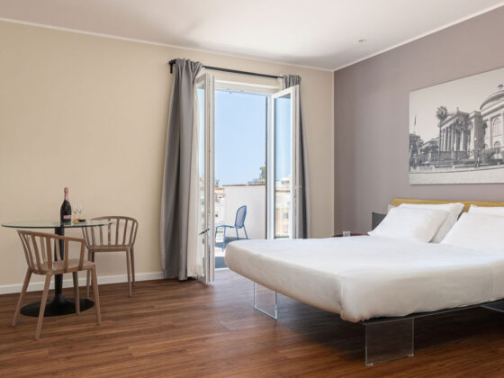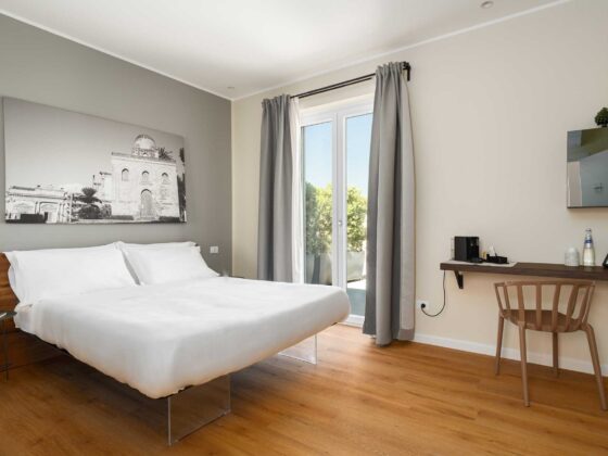 Elegante camera con terrazza privata, dotata di aria condizionata, Wi Fi, TV a schermo piatto e cassaforte.